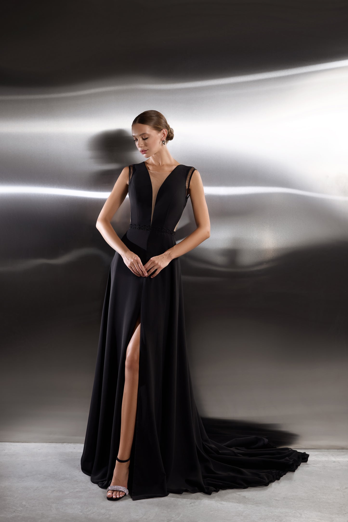 Rochie lungă, neagră, perfectă pentru evenimente speciale. Are un design sofisticat, cu un decolteu în V și un slit lateral care adaugă un aer de eleganță. Spatele este decorat cu dantelă fină, pentru un plus de rafinament.