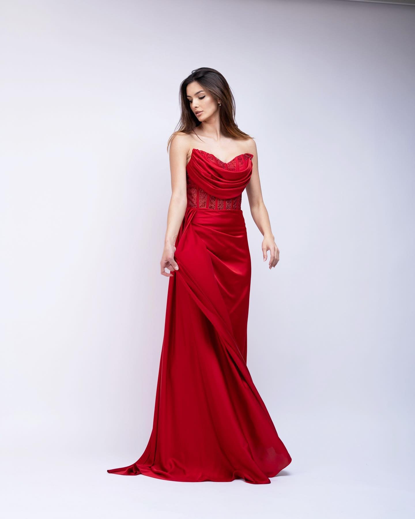 Este o alegere perfectă pentru evenimente speciale sau apariții pe covorul roșu, atrăgând toate privirile prin stilul său atrăgător și elegant. Această rochie roșie emană eleganță și senzualitate. Croiala este sofisticată, cu un decolteu în stil drapat și o crăpătură îndrăzneață pe picior, adăugând o notă de glamour și rafinament. Materialul lucios și detaliile intricate în zona taliei completează designul, subliniind silueta purtătoarei.
